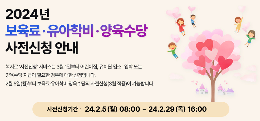 ※ 사전신청 종료 후 2.29.(목) 16:00 ~ 2.29.(목) 24:00 기간동안 보육료, 유아학비, 양육수당, 부모급여, 아동수당 서비스 신청이 중단됩니다.